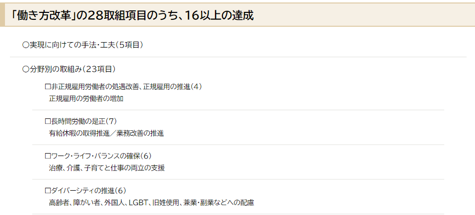 「働き方改革って何をしたら良い?」という企業の指標として活用いただけるよう、認定事業では独自に専門家と協議して「非正規雇用の処遇改善、正規雇用促進」「長時間労働の是正」「ワーク・ライフ・バランスの確保」「ダイバーシティの推進」の4分野を設け、分野別に28の取組項目を設定しました。