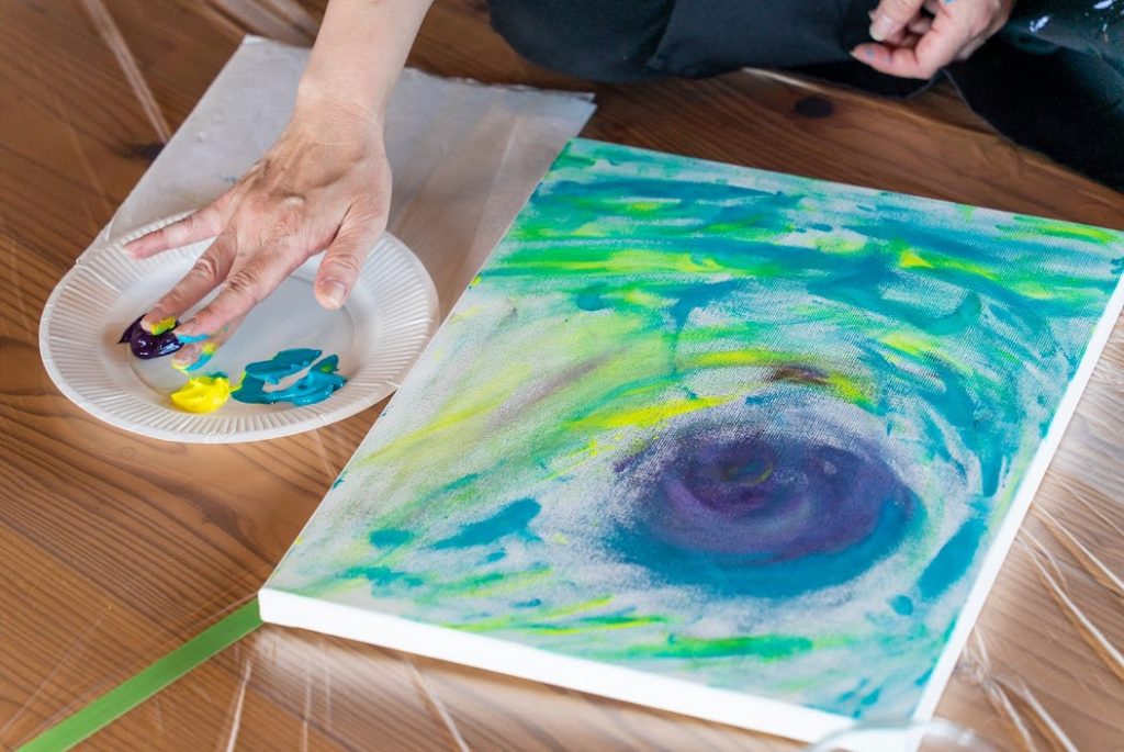 まず朝は9:30からart dropさまよりアーティストをお招きしてキャンバスに好きな色の絵具を塗っていきます。