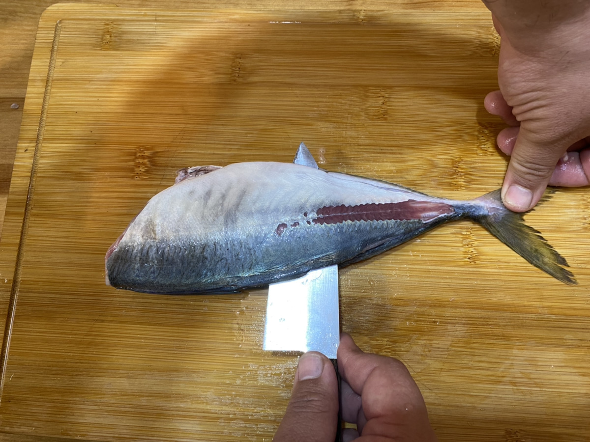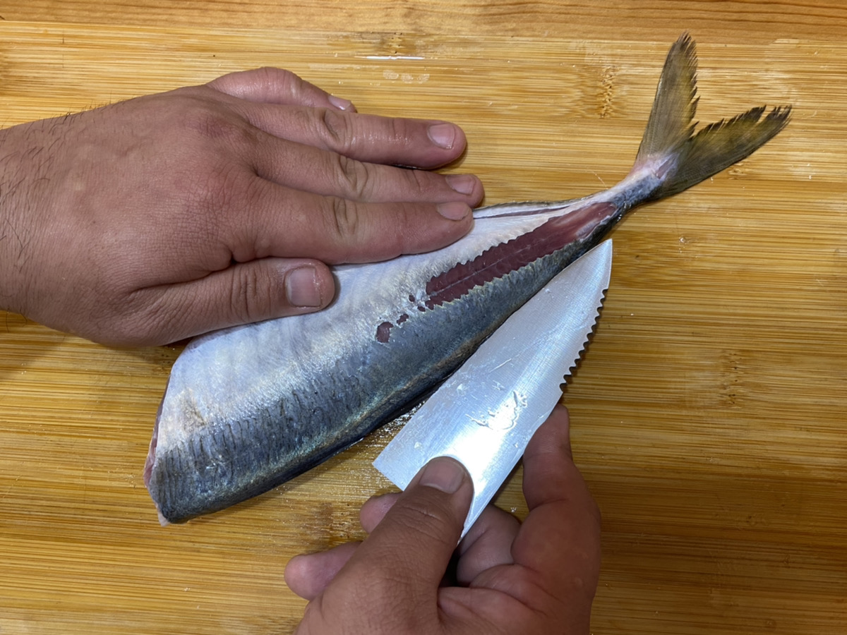 アジには中骨があり、ピンセットで一本ずつ抜く方法もありますが、包丁をV字に入れる方法で中骨を抜き取ることも可能です。
