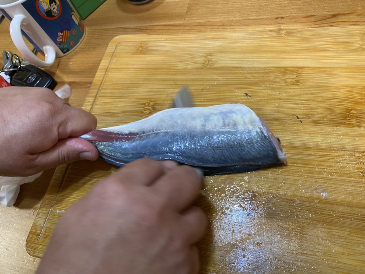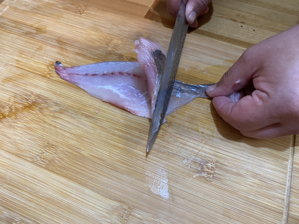 反対側も同じく包丁を入れ中骨を断ち切ります。