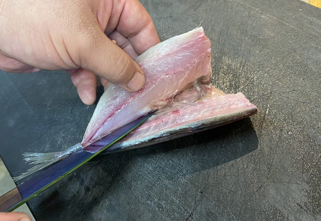 ⑥中骨部分まで到達したら腹骨と中骨を切り離し、腹側を捌く(この時もお腹の皮まで切り離さないように気を付けましょう)