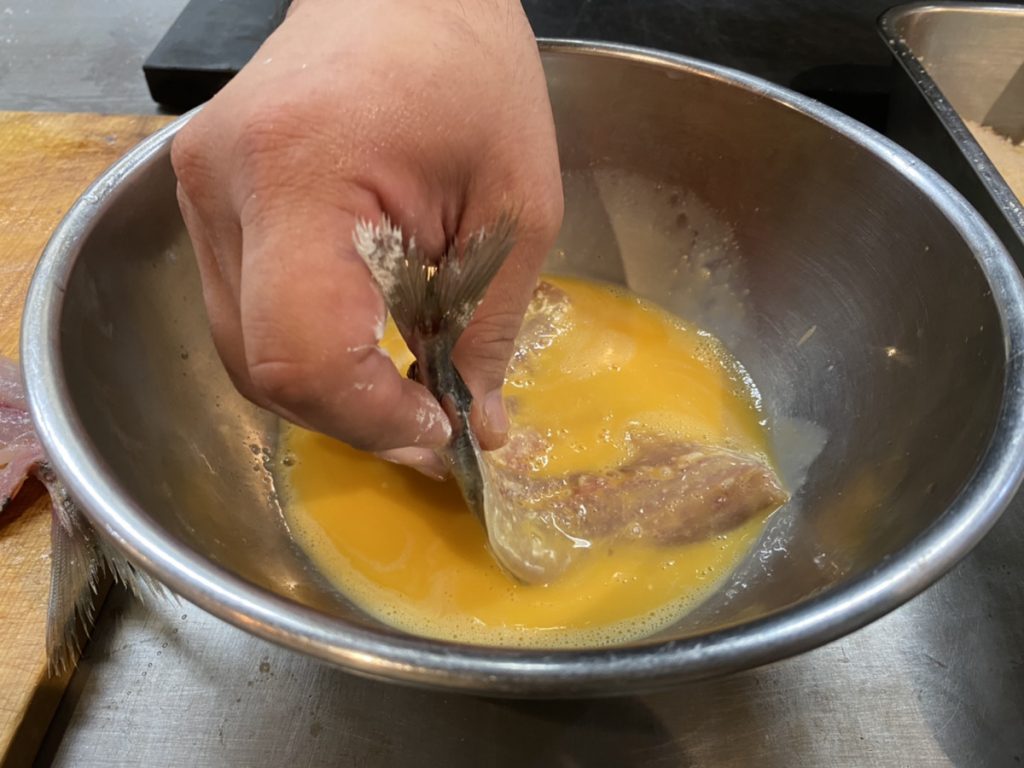 しっかりと溶いた玉子に潜らせます。玉子の白身が溶けていないとダマになるので切るように溶きましょう!
