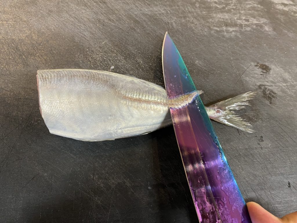 ⑥中骨部分まで到達したら腹骨と中骨を切り離し、腹側を捌く(この時もお腹の皮まで切り離さないように気を付けましょう)