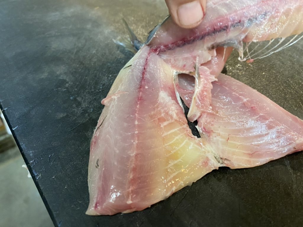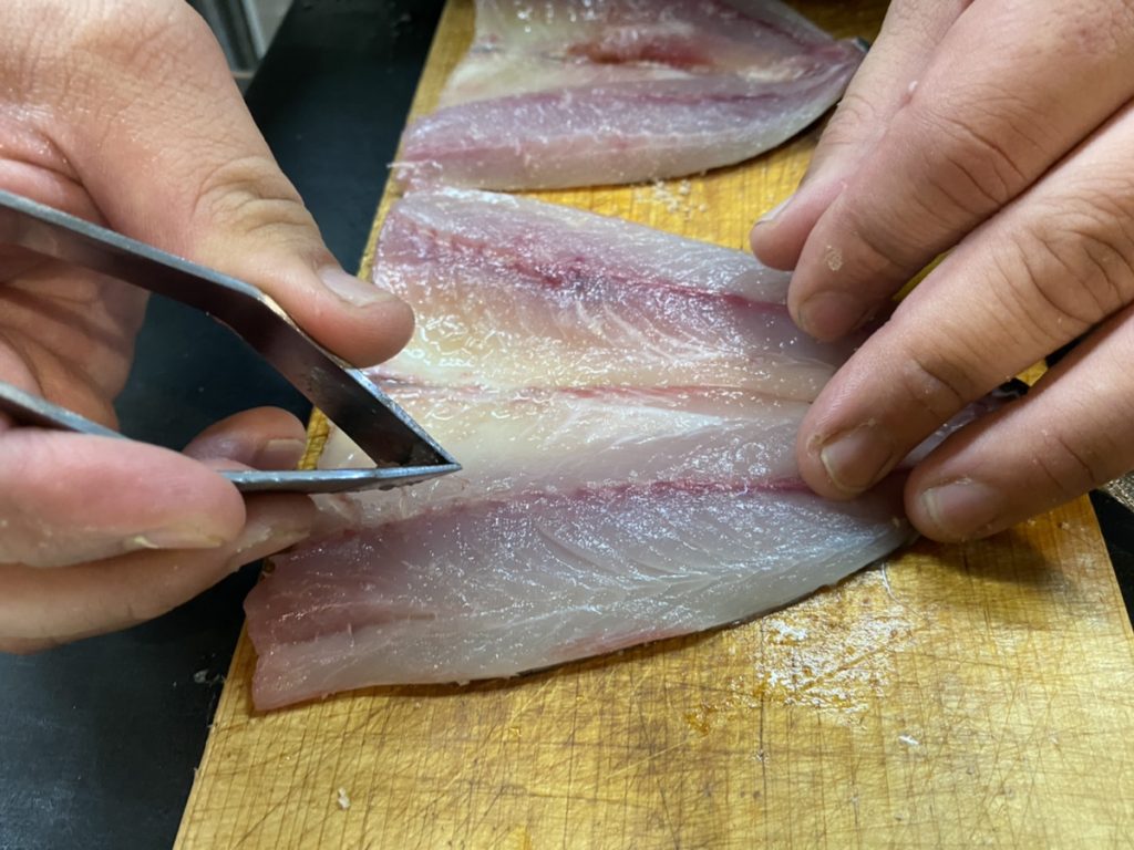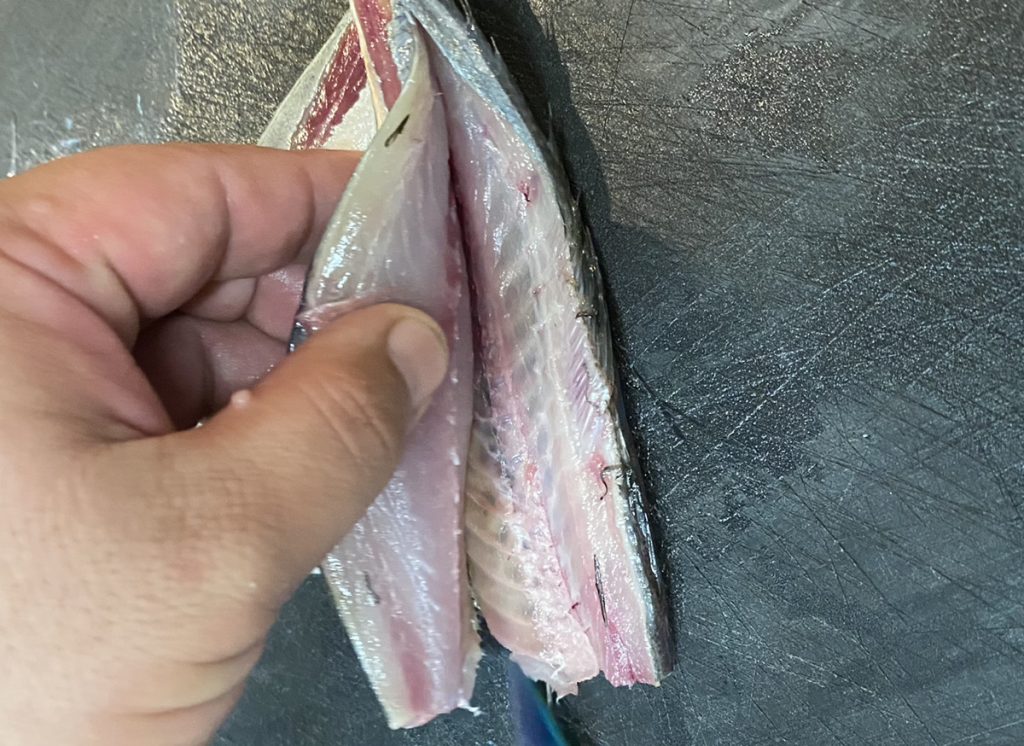 ⑨骨抜きで中骨をピンセットで取り除く、またはV字カットで中骨部分を取り除く