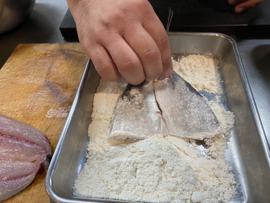身の全体に小麦粉をつけます。余分が粉がつかないようにきれいに払い落します。