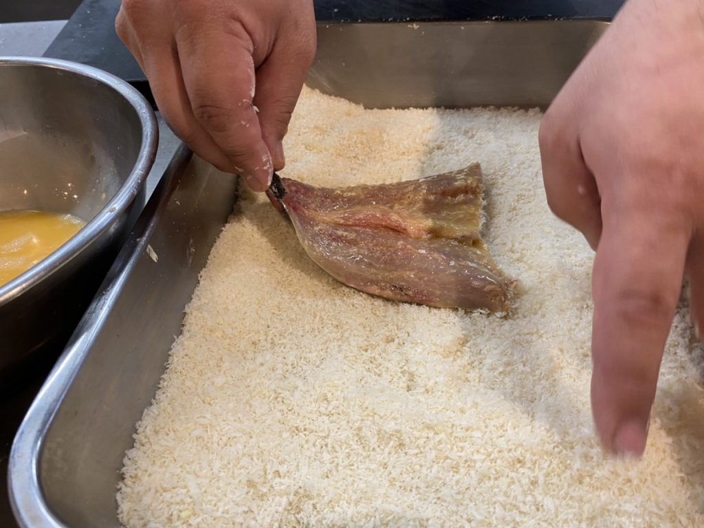 わたしのオススメは中パン粉の細目です。ライトな仕上がり感になりますので、鯵本来のポテンシャルを引き出せるように思います。
