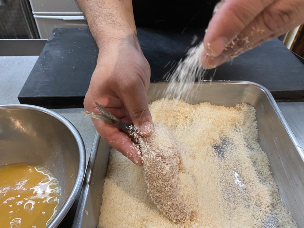 パン粉をつけますが、この作業は慎重に行います!パン粉をつける際にぎゅっと力をいれて押しつけてしまうとパン粉が必要以上に付いてしまい、脂っこい仕上がりになってしまいます。