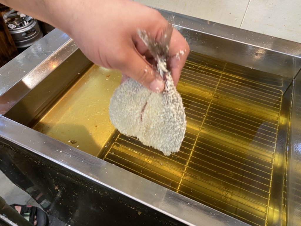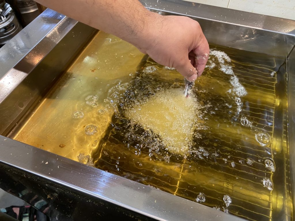 油に入れる際は、はじめに身の方を下にして揚げると美しい仕上がりになります。