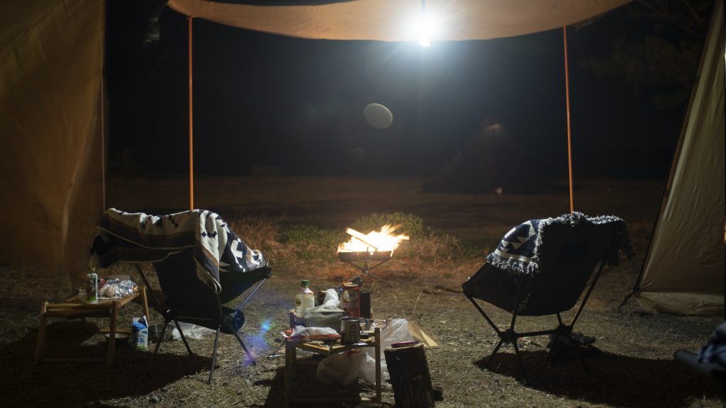 テントやチェア、焚き火台も無事設置し終え、一息ついたところで