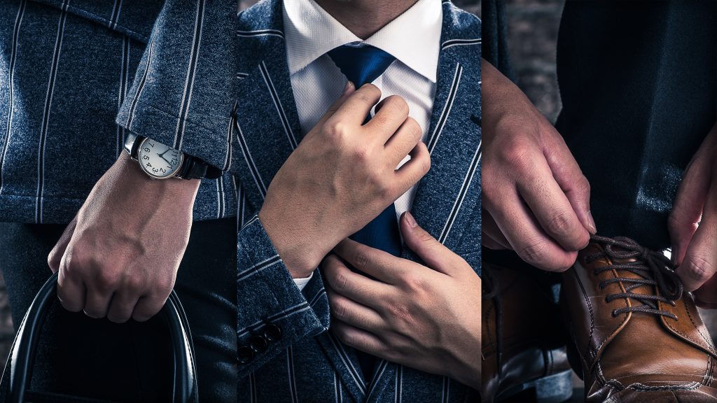 靴が黒であればベルトも黒。ジャケットの丈は手のひらの中間くらい。ネクタイとシャツの色を1つだけ合わせるなどコーディネイトで自分の価値がグーッと上がる。