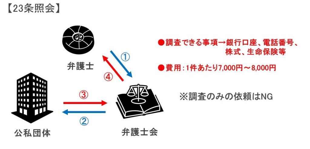 23条照会とは、弁護士法23条の2「弁護士は、受任している事件について、所属弁護士会に対し、公務所又は公私の団体に照会して必要な事項の報告を求めることを申し出ることができる。」という制度です。