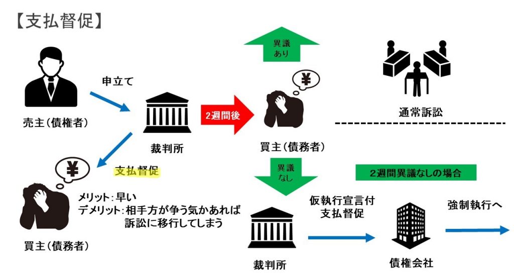 支払督促とは、裁判所において請求が認められる場合に、支払督促を買主・借主に送付して2週間以内に異議がなければ仮執行宣言付支払督促が送付され、さらに2週間異議がなければ、強制執行を行うことができるという手続です。ただし、買主・借主から異議申立てがなされると訴訟に移行します。