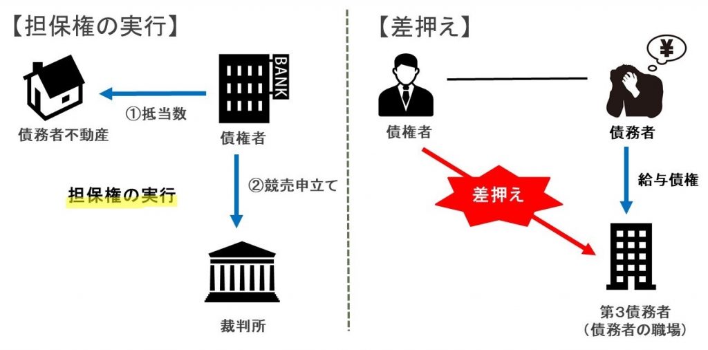 執行は、担保権の実行という方法と差押えという方法の2つがあります。
