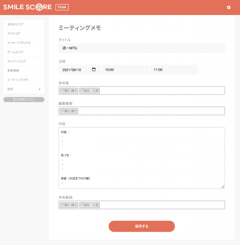メモは、組織の信頼関係を高める”感情コミュニケーションツール”「SMILE SCORE(スマイルスコア)」を利用すると一人一人このように最近の気持ちの状態を確認しながら、ミーティングを行うことができ、ミーティング内容のメモを残すことができます。面談者に「共有」も可能です。SMILE SCORE(スマイルスコア)を使わなくても、パソコン上でのメモツールを利用したり、紙のノートでも構いません。大切なのは、本人と面談した際に本人と話したことを忘れないこと。形だけで終わらせないことです。