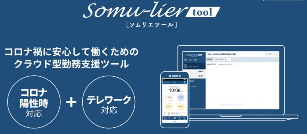 働き方改革やアフターコロナといった状況下でNewNormalな働き方に取り組み始める企業が増加しています。 一方で、そうした働き方を導入したくても、 「整備すべき環境が多すぎる」 「導入に人員やコストが割けない」 「ツールが多すぎて手間がかかってしまう」 といった、お悩みを抱える総務担当者の方も多いのではないでしょうか? ソニービズネットワークス株式会社が提供するsomu-lier tool[ソムリエツール]は、そうしたお悩みの解決をサポートする【完全無償】のサービスです。 新型コロナ陽性時対応と濃厚接触者管理 ・毎日の体調入力および管理 、テレワーク勤怠管理 ・既存の勤怠システムに取込むためのデータエクスポート などを、一つのツールで完結させることができるサービスとなっておりますので、ぜひご活用ください。