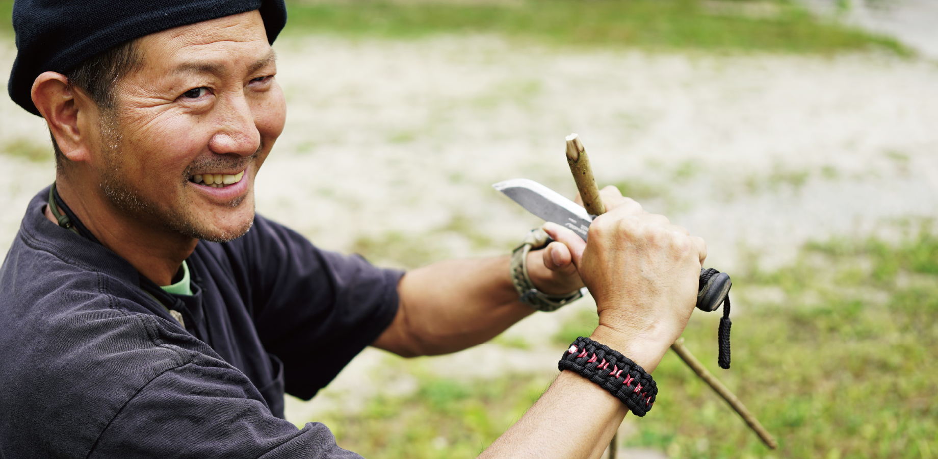 「ワイルドにそと遊び、子と遊び」を掲げ、ブッシュクラフト講座や大人のみならず、子どもや親子向けのサバイバルキャンプなど九州を中心に活動するアウトドアマン「やっし」。防災士の知識や自身も被災した阪神淡路大震災の経験を元に企業向けの災害対策研修なども行う。