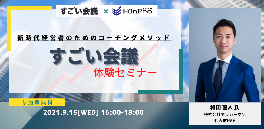- 【緊急事態宣言延長のため延期とさせて頂きます。】新時代経営者のためのコーチングメソッド『すごい会議』体験セミナー(9/15)