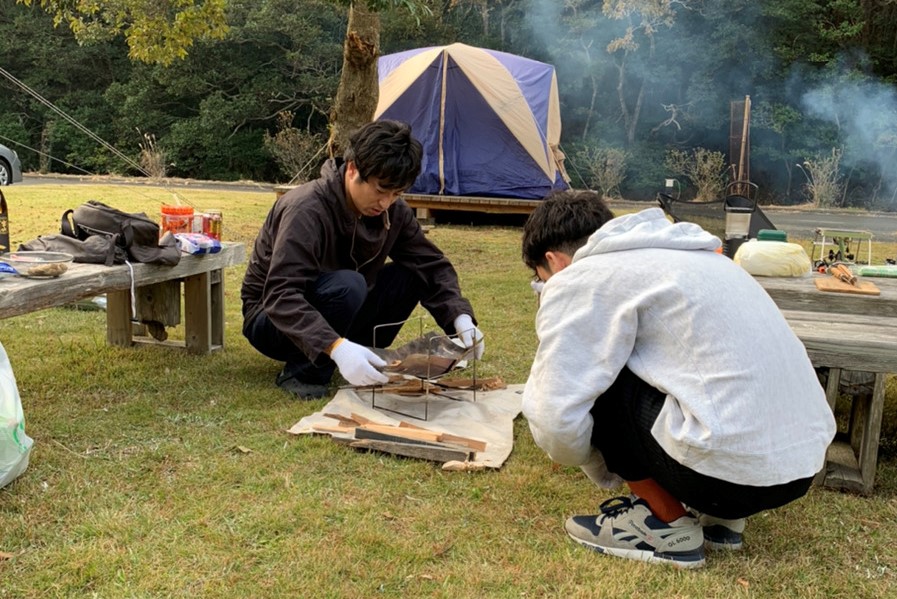オートキャンプ場に着くと各々自分のキャンプサイトで滞在期間中の環境を整えました。なお、今回は感染症対策の観点から1人につき1テントで宿泊させていただきました。