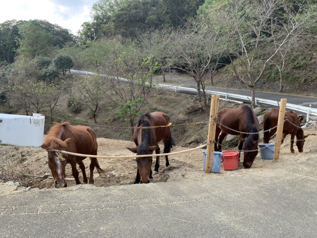 キャンプサイトへの道中、パーク内ふれあい牧場で飼育されている日本在来馬「対州馬」とすれ違うことが出来ました。「対州馬」は、絶滅が危惧されていることから2019年4月に対馬市の天然記念物に指定されております。今回のイベントでは体験できませんでしたが、あそうベイパーク内のふれあい牧場では、対州馬のエサやり体験などのプランも設けてあります。